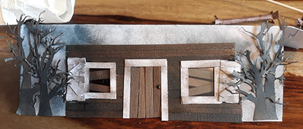 I made the cabin by chopping up American Cardstock in tiny slices, colouring them with stamping inks, and making little boards with them. They were stuck directly to the back, I cut two holes for the windows so I could light it from behind. I added transparency to the windows, and then boarded them up with more “wood”. The roof (which is just temporary in the photos—it can go on last) was a triangle of paper with more strips of paper added. The two columns are wood skewers with a layer of paper around them. I also put two lights together and covered them with red transparency in the hope it would look like two red eyes… it almost works.